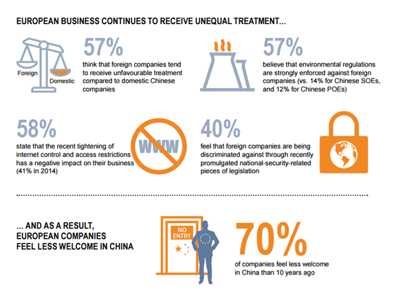 Al tema del status de economía de mercado se añade el creciente descontento de las empresas europeas en el mercado chino, que consideran que se las trata de forma discriminatoria en relación con las empresas locales. El gráfico adjunto está extraído del último estudio de la Cámara de Comercio europea en China acerca del marco de negocios para las empresas europeas (elaborado en base a una encuesta entre éstas), y recoge algunas de las conclusiones más significativas del mismo. Un 57% de las empresas encuestadas consideran que las corporaciones extranjeras reciben un tratamiento desfavorable en comparación con las empresas domésticas chinas.