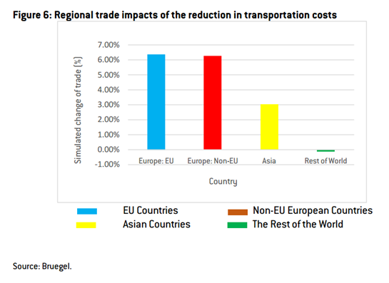 Las implicaciones de OBOR han sido poco estudiadas hasta el momento. Un trabajo reciente de interés es el de Alicia García-Herrro y Jianwei Xu [I], publicado por el Instituto Bruegel. Su conclusión básica es que la reducción de los costes de transporte facilitará un gran aumento del comercio en los países europeos, de un 6% (como puede verse en el cuadro adjunto). En la región asiática también crecerá el comercio, pero en menor medida, un 3%, mientras que el resto del mundo experimentará una muy ligera reducción de los flujos comerciales.