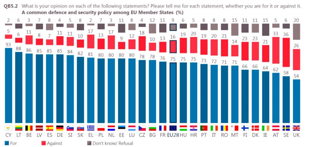 Sin embargo, ¿Qué dicen los europeos cuando se les pregunta por la Seguridad y Defensa de la Unión? Podemos acudir a varios estudios, todos ellos realizados por las instituciones comunitarias, y vemos cómo el ciudadano pide un esfuerzo mayor en este ámbito. En el Eurobarómetro de otoño de 2019 [2], encontramos el dato de que tres de cada cuatro ciudadanos europeos encuestados están a favor de una Política Común de Seguridad y Defensa, mientras que tan solo el 16% se muestra en contra, el porcentaje más bajo desde 2004.